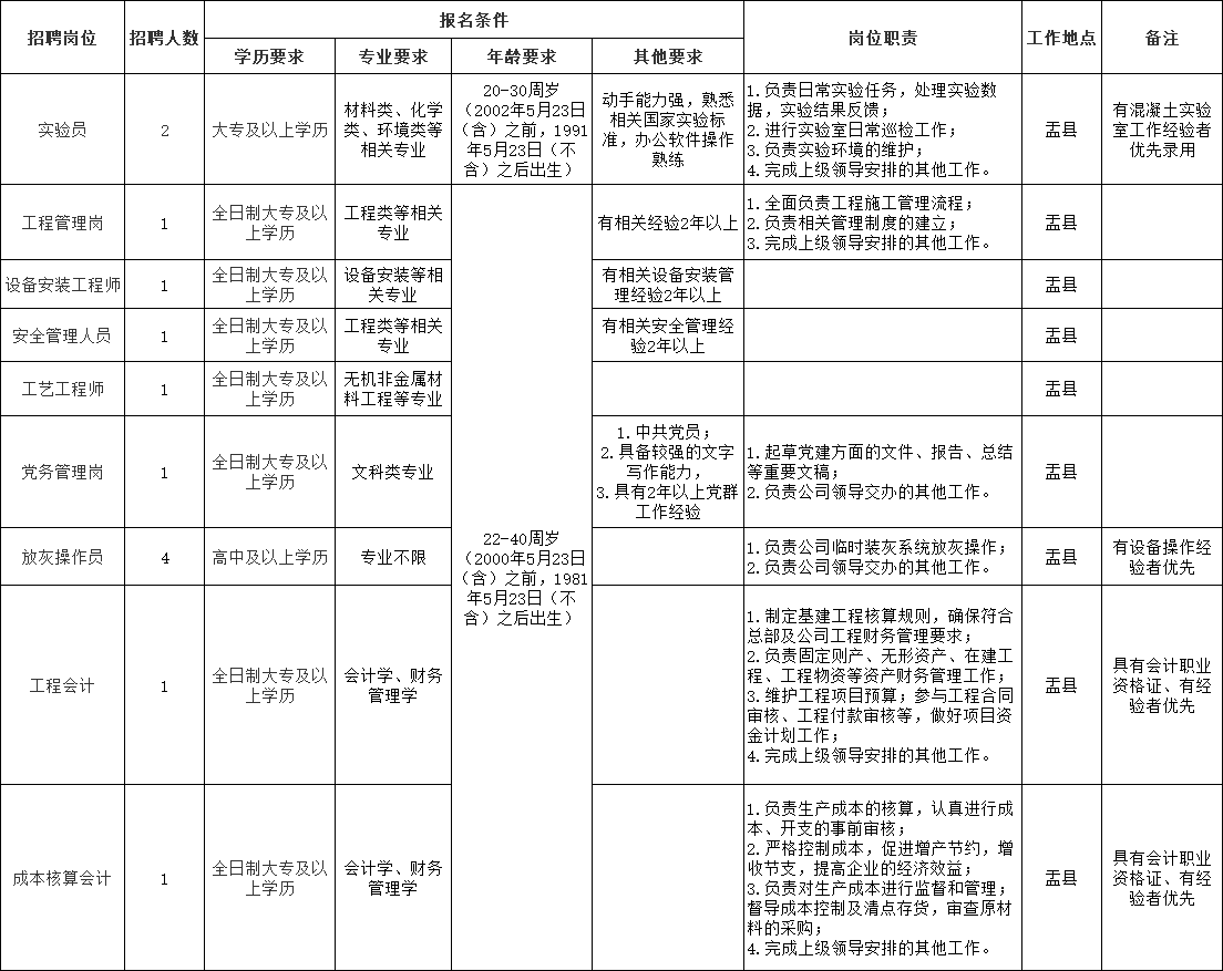为适应山西大地海科环保科技有限公司(以下简称:“大地海科”)全方位高质量发展的需要,根据实际工作需求,现面向社会公开招聘工作人员13名(其中实验员2名,工程管理岗1名,设备安装工程师1名,安全管理人员1名,工艺工程师1名,党务管理岗1名,放灰操作员4名,工程会计1名,成本核算会计1名),现就有关事项公告如下:
