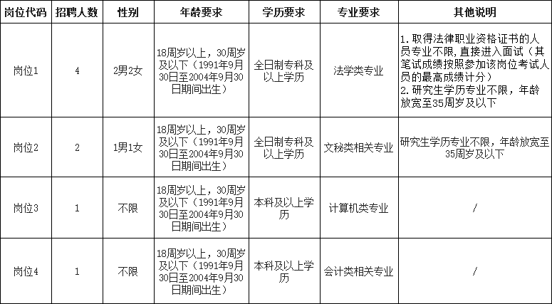 (二)岗位2:学历要求为全日制专科及以上学历;研究生学历专业不限,年龄放宽至35周岁及以下。
