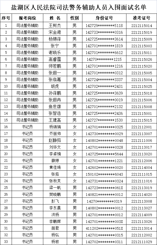 根据《运城市盐湖区人民法院2022年司法辅助人员招聘公告》的相关要求,经过网上报名、资格审查、笔试测试、速录测试/体能测试等环节,现就面试有关事项通知如下: