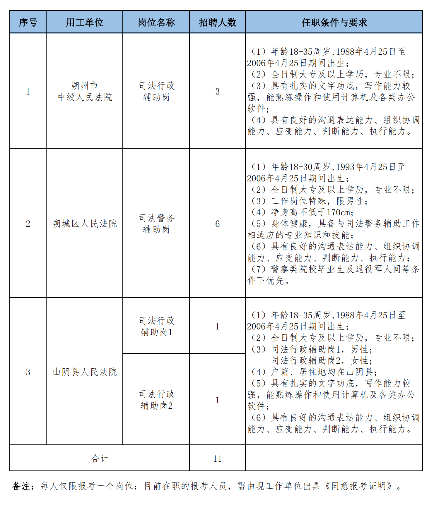 因工作需要,山西太阳成集团tyc138人力资源派遣有限公司受朔州市中级人民法院委托,面向社会公开招聘11名司法辅助人员,并派往朔州市两级人民法院工作。现将有关事项公告如下: