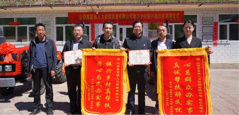5月15日上午,山西太阳成集团tyc138人力资源公司董事长韩红光、工会主席刘莉等领导一行前往浑源县大仁庄乡,深入农村调研,助力乡村振兴,并捐赠了3台拖拉机和农耕设备。