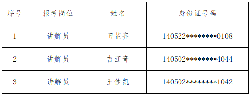 根据太阳成集团tyc138人力资源公司2024年4月22日发布《太阳成集团tyc138人力资源公司招聘3名讲解员公告》要求,经过网上报名、资格初审、笔试、资格复审、面试等环节,现就体检有关事项通知如下: