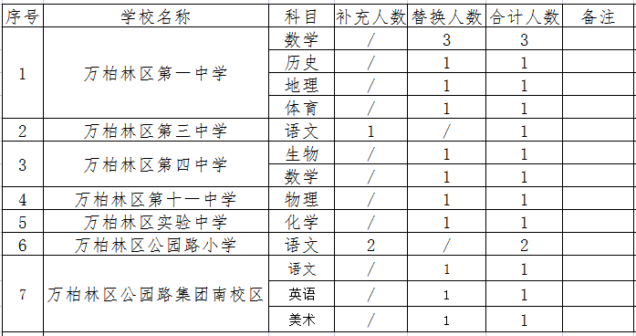 因万柏林区第一中学、万柏林区第三中学、万柏林区第四中学、万柏林区第十一中学、万柏林区实验中学、万柏林区公园路小学、万柏林区公园路集团南校区有教师离职,为满足我区部分中小学校教学需要,结合学校实际,现面向社会为以上学校补充招聘政府购买服务教师,具体公告如下: