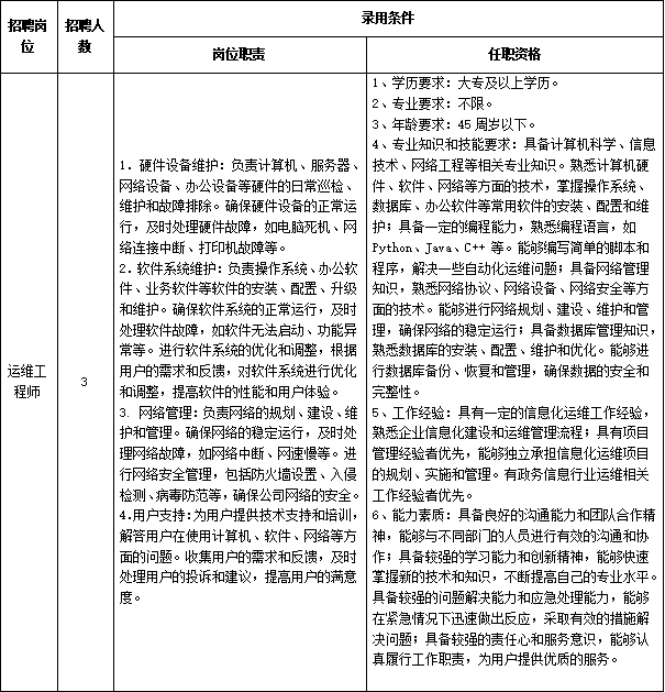 根据工作需要,山西太阳成集团tyc138人力资源派遣有限公司面向社会公开招聘运维工程师3名,并派往山西某有限公司工作,现将有关事项公告如下: