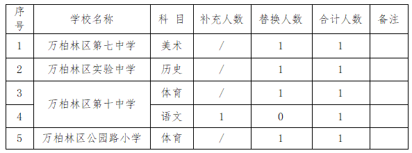 因万柏林区第七中学、万柏林区第十中学、万柏林区实验中学、万柏林区公园路小学有教师辞职,为满足我区部分中小学校教学需要,结合学校实际,现面向社会为以上学校补充招聘政府购买服务教师,具体公告如下:
