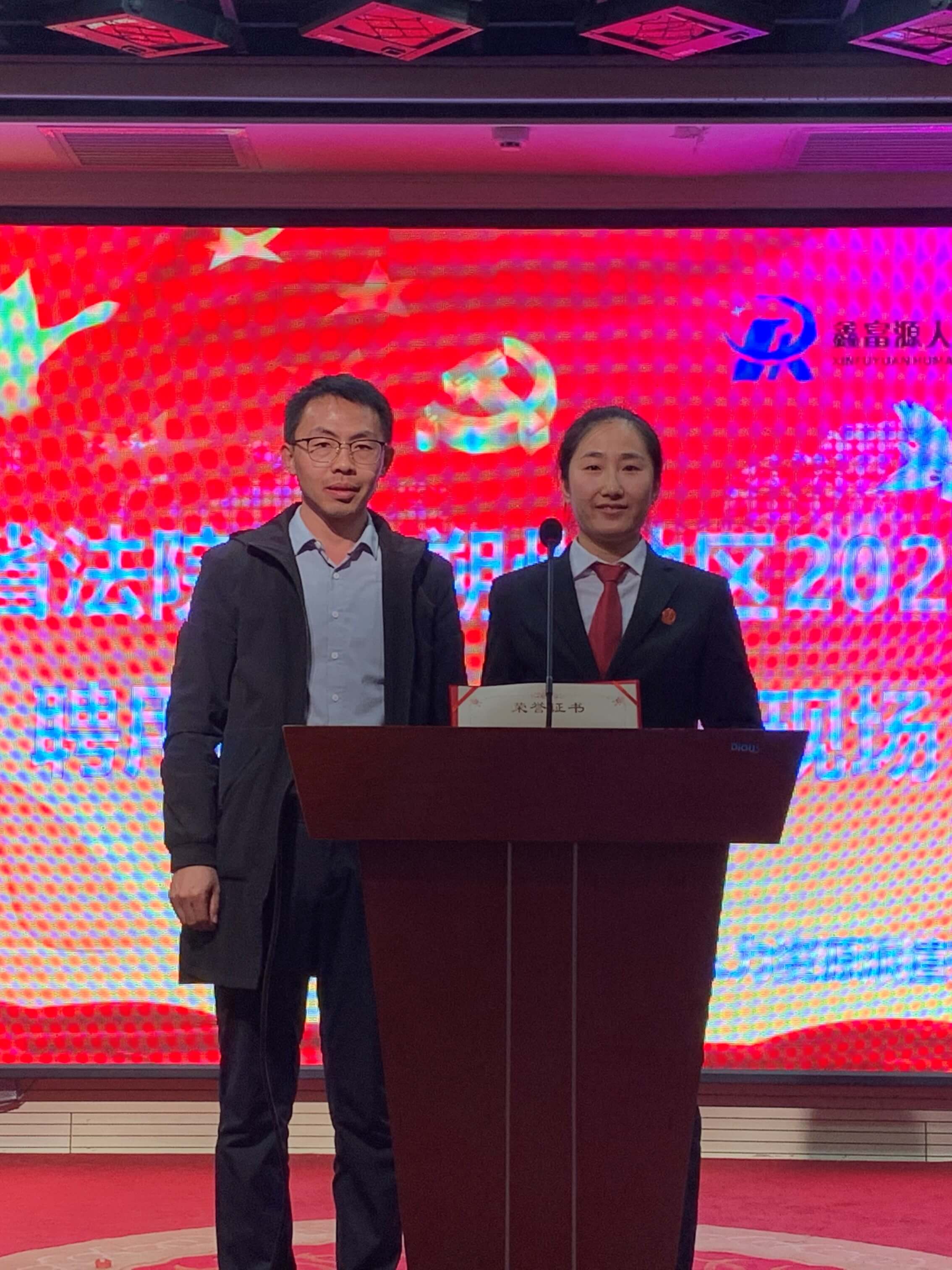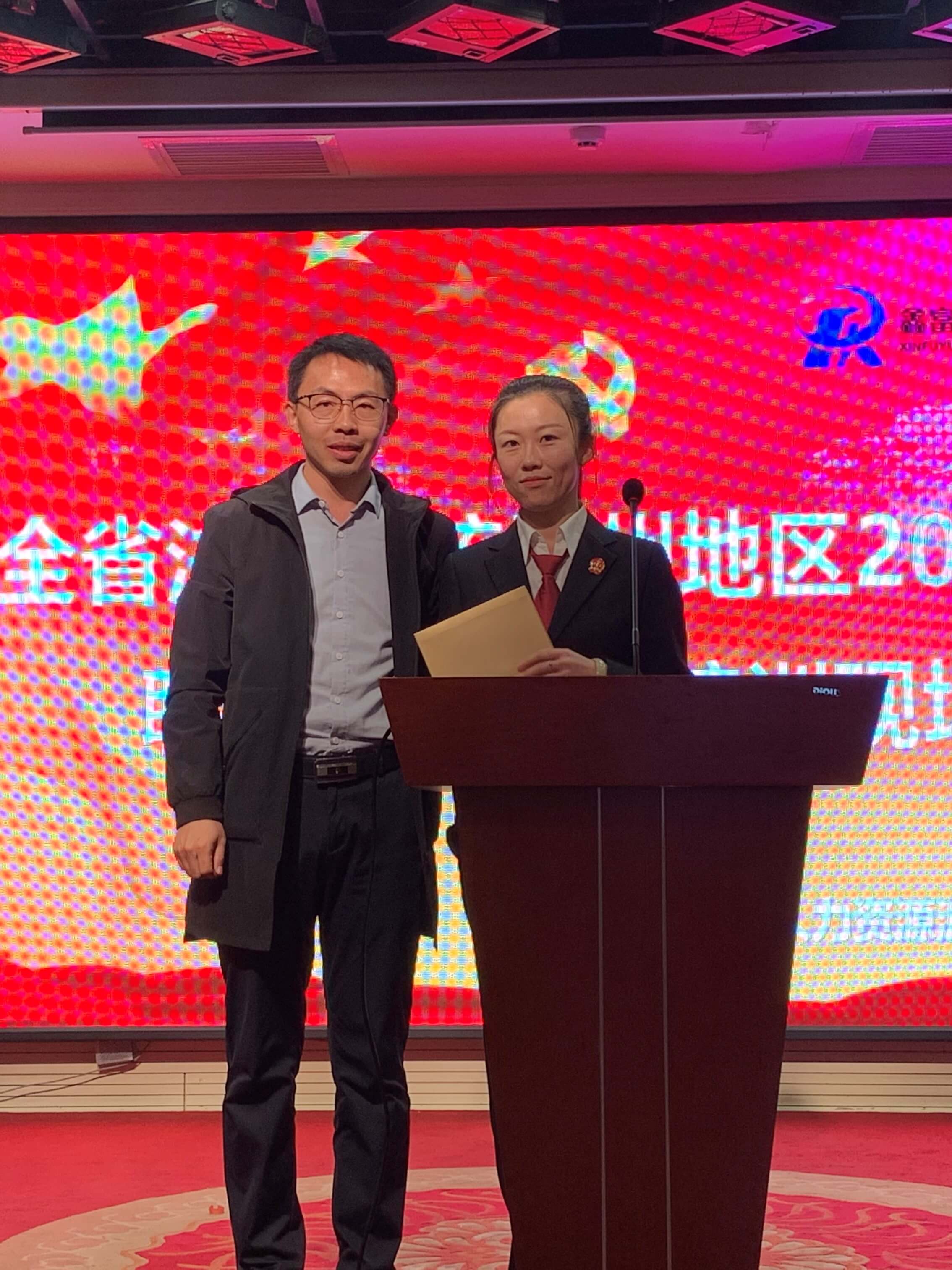 山阴法院书记员伊庆玲同大家进行了工作心得分享。我公司朔州分公司经理李晔为伊庆玲颁发征文活动获奖荣誉证书。