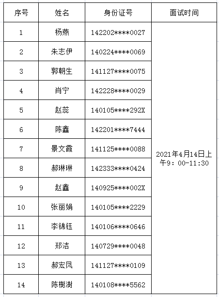 根据山西太阳成集团tyc138人力资源派遣有限公司于2021年3月1日发布的公开招聘3名外派人员的相关要求,经过网上报名、资格审查、理论考试等环节,现就面试有关事宜通知如下:
