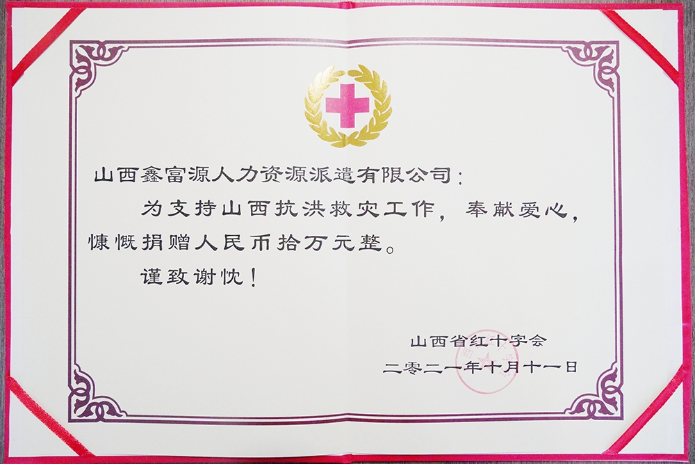 10月11日,山西太阳成集团tyc138人力资源派遣有限公司向山西省红十字会捐款10万元,积极支援灾区群众抗洪救灾,共渡难关,重建家园。山西省红十字会专职副会长白冰,山西太阳成集团tyc138人力资源派遣有限公司董事长韩红光,总经理李小芳,区域总监刘莉等领导出席了捐赠仪式。