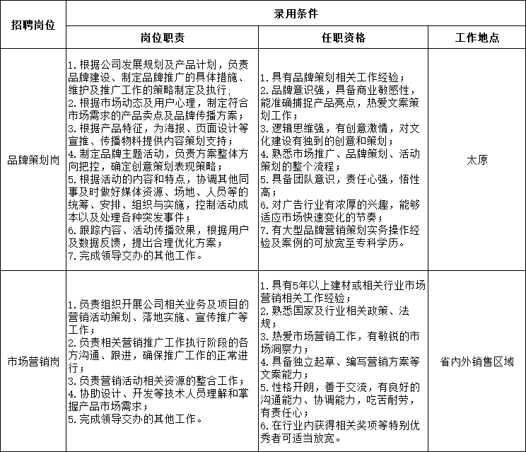 (2)市场营销岗,大专及以上学历,市场营销、工商管理学、建筑工程及相关专业。