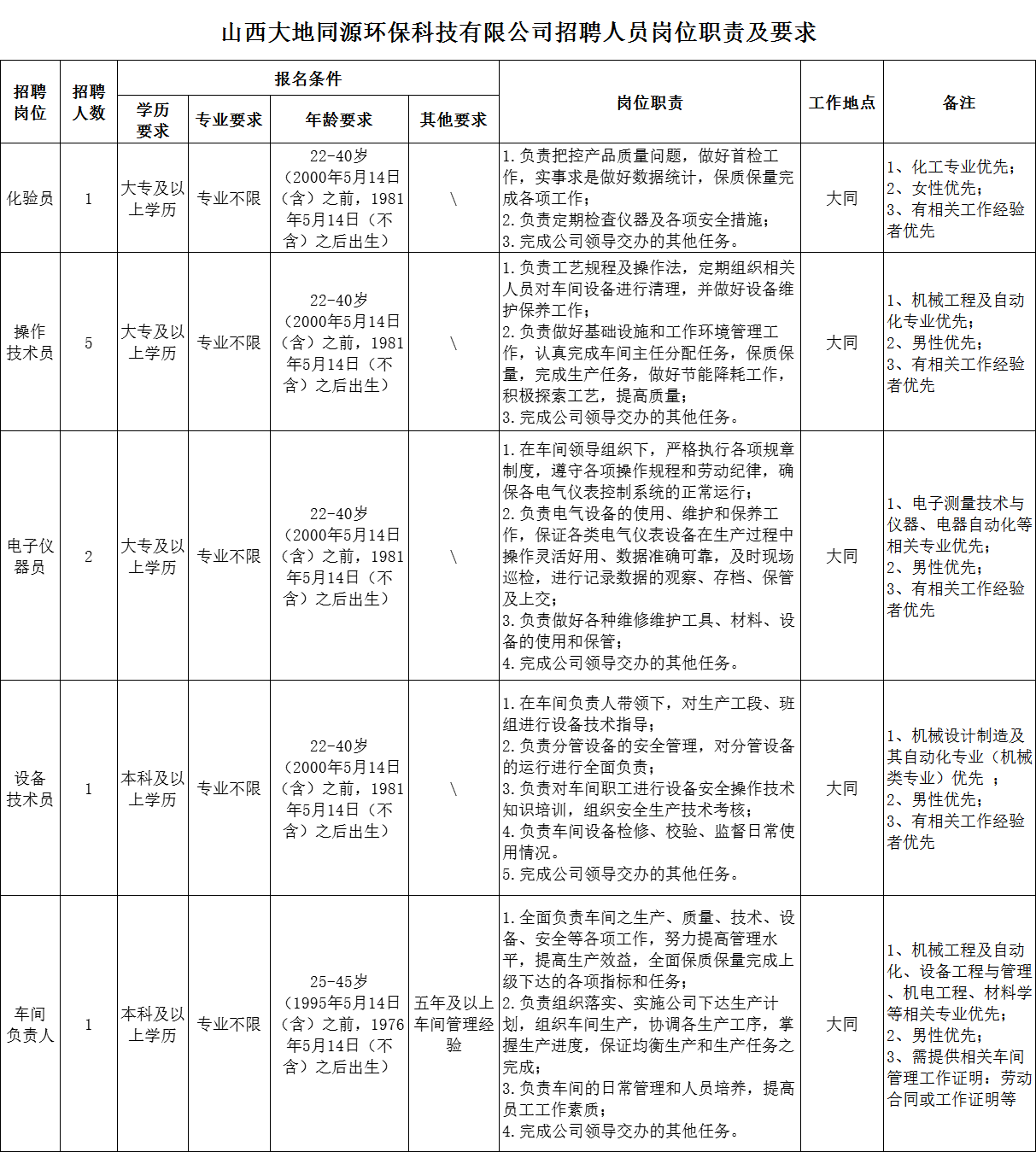 为适应山西大地同源环保科技有限公司(以下简称:“大地同源”)全方位高质量发展的需要,根据实际工作需求,现面向社会公开招聘工作人员10名(其中化验员1名,操作技术员5名,电子仪器员2名,设备技术员1名,车间负责人1名),现就有关事项公告如下: